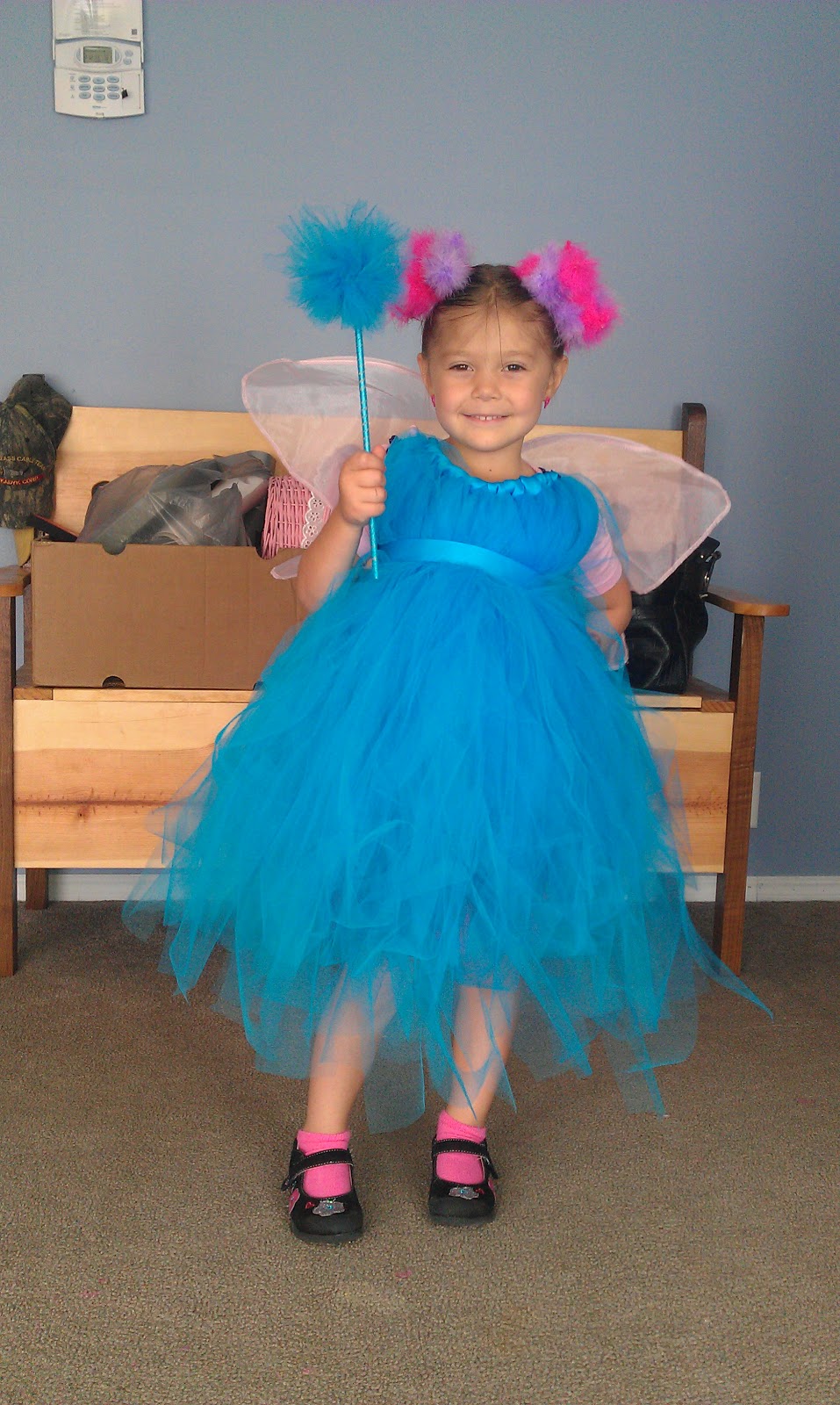 Well its a good thing that Carmen had to go back to Wal-Mart the next day. Different town. There are 3 seperate towns all about 25 mins away in different directions, that have Wal-Mart. I called her while she was at Wal-Mart because 2 rolls of tulle just covered half. Thankfully, she brought me back 3 more rolls, just to be safe. I used wings that she already had and made her a wand out of a dowel rod and leftover tulle. I didn't take pictures along the way, (sorry) but here's what you need and how I did it.